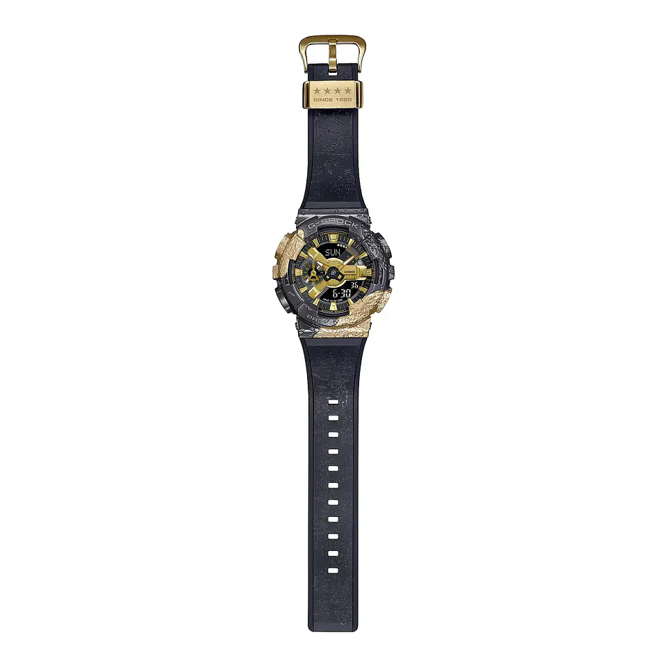 Trace o seu próprio percurso com um relógio G-SHOCK 40th Anniversary Adventurer's Stone de edição limitada. Junte-se a nós para celebrar o 40.º aniversário do G-SHOCK, escolhendo um destes espetaculares relógios revestidos a metal, que são inspirados pelas pedras utilizadas pelos aventureiros para navegar desde a antiguidade. As cores especiais dos minerais utilizados pelos antigos navegadores para encontrarem o seu caminho são reproduzidas nos designs destes relógios com forjamento, revestimento iónico e processos de encobrimento, dando a cada aro metálico um aspeto único. As braceletes são fabricadas com resina colorida ou translúcida e são texturizadas de forma única com técnicas de estampagem a quente e moldagem a cores Garal. Estes relógios de edição limitada celebram o 40.º aniversário do G-SHOCK em pleno: a frase “SINCE 1983” aparece no mostrador, o logótipo "40th" projetado por Eric Haze está gravado na parte traseira da caixa e há quatro estrelas para 40 na presilha da bracelete.